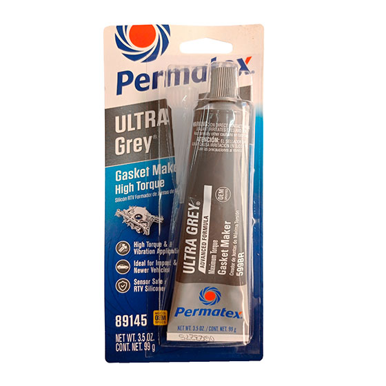 - Silicona oxímica Ultra Grey no corrosiva cura cuando es expuesto a la humedad del aire formando una junta de silicón ahulado, flexible y tenaz. El producto ya curado resiste el envejecimiento, medio ambiente, y ciclos térmicos sin endurecer, encoger o fracturarse. Diseñado para funcionar bajo las condiciones de carga más alta de los motores con patrones de pernos poco espaciados (generalmente no diseñados en los EE. UU.) y tiene excelente resistencia al aceite y al agua-glicol.